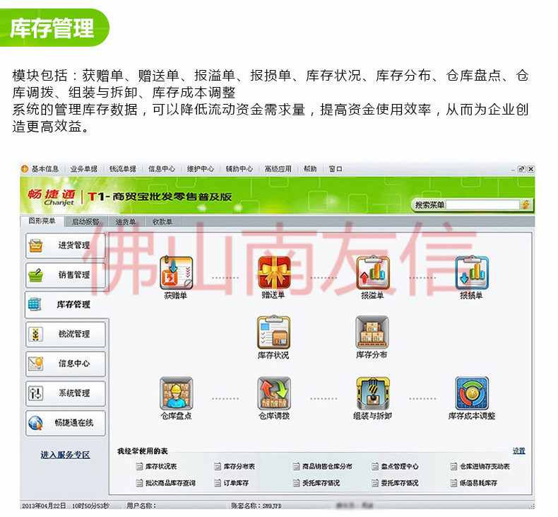 - 特色业务管理:提供进货、退货、换货、换件、组装、销售、赠送、盘库、